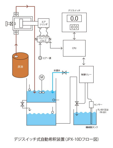 | JPX-10Dのおもな特徴 ・特許出願中 ・デジタル方式により作りたい濃度が目視で解る ・水道水または工業用水どちらも使用可能 ・原液を0.1%、0.2%、0.3%~0.1%単位で10%まで精密に計測 ・希釈方法は水10Lを計測、原液はデジタルスイッチを操作して 表示された数値で計測、希望濃度を簡単に作る事ができます。 ・どのタイミングで液を作ってもいつでも濃度変化なし ・希釈した液をタンク内でプロペラで撹拌します ・SUBタンクに移送して液をプール ・さらにSUBタンクから工作機械側へ液を自動補充~無人運転 ・自動補充に必要なセンサー、リレー装置、モーターバルブを標準装備 ・タンク側センサーはキーエンスFL001又はFR-SO1をご用意 ・省スペースで場所を取らず 0.4m×0.4m、移動も簡単 約30kg ・電源はAC100Vを使用 エアー圧力0.5Mpa ・低価格 ・液寿命に必要なPH計測器(OPTION)) ・原液18L缶は本機下に収まります ・工場内に絶対液漏れを起こさない! 数々の安全装置が監視しています。 |